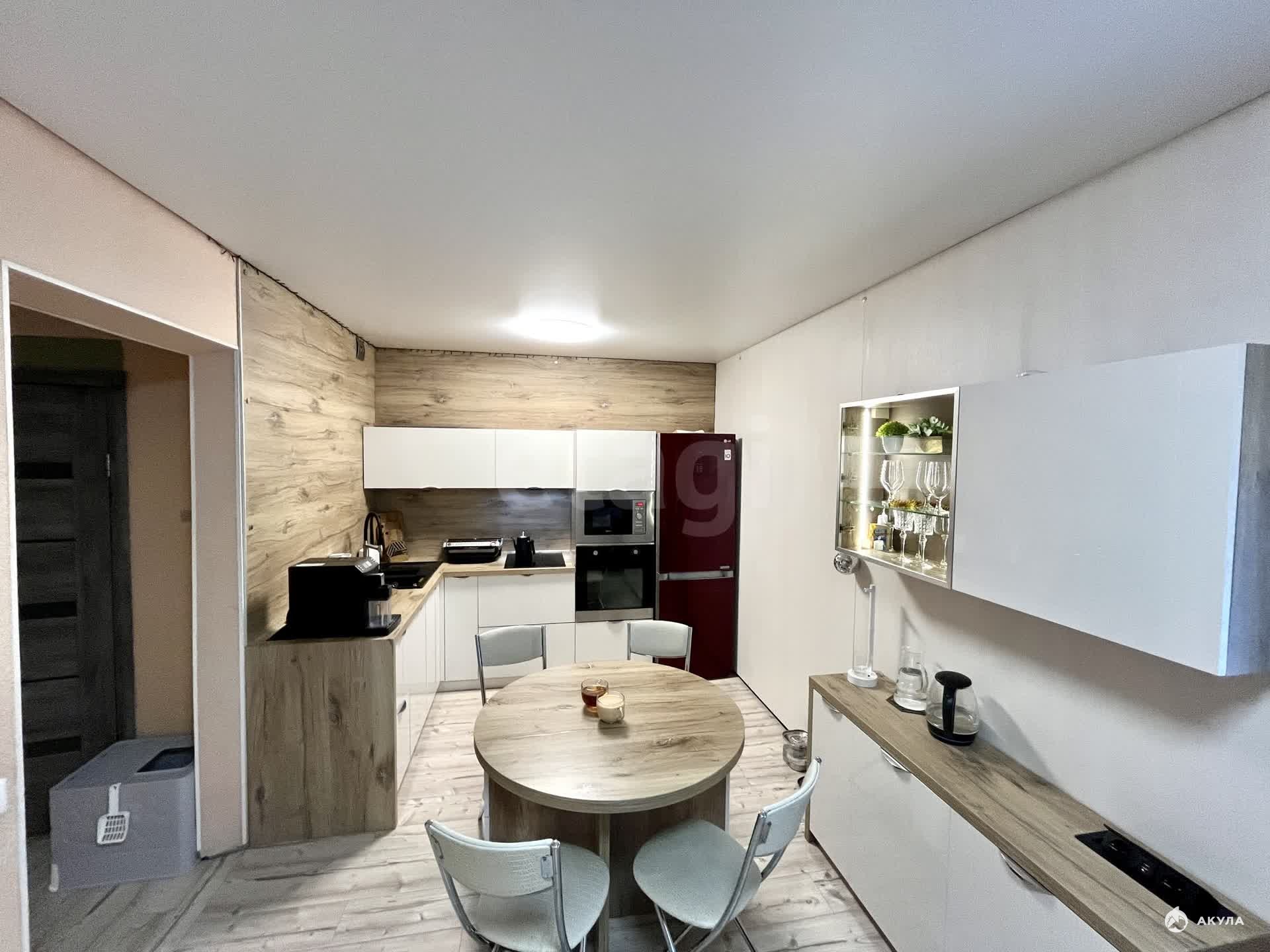 Кухонный гарнитур и стол, варочная поверхность, духовой шкаф, посудомойка и встроенная микроволновая печь остаются в подарок.